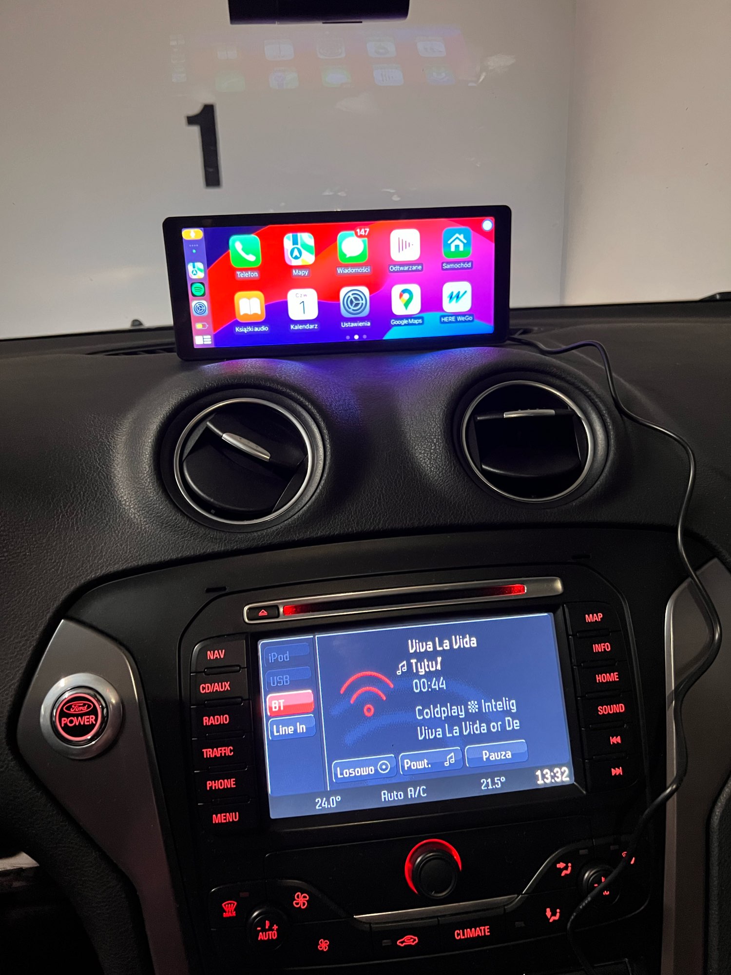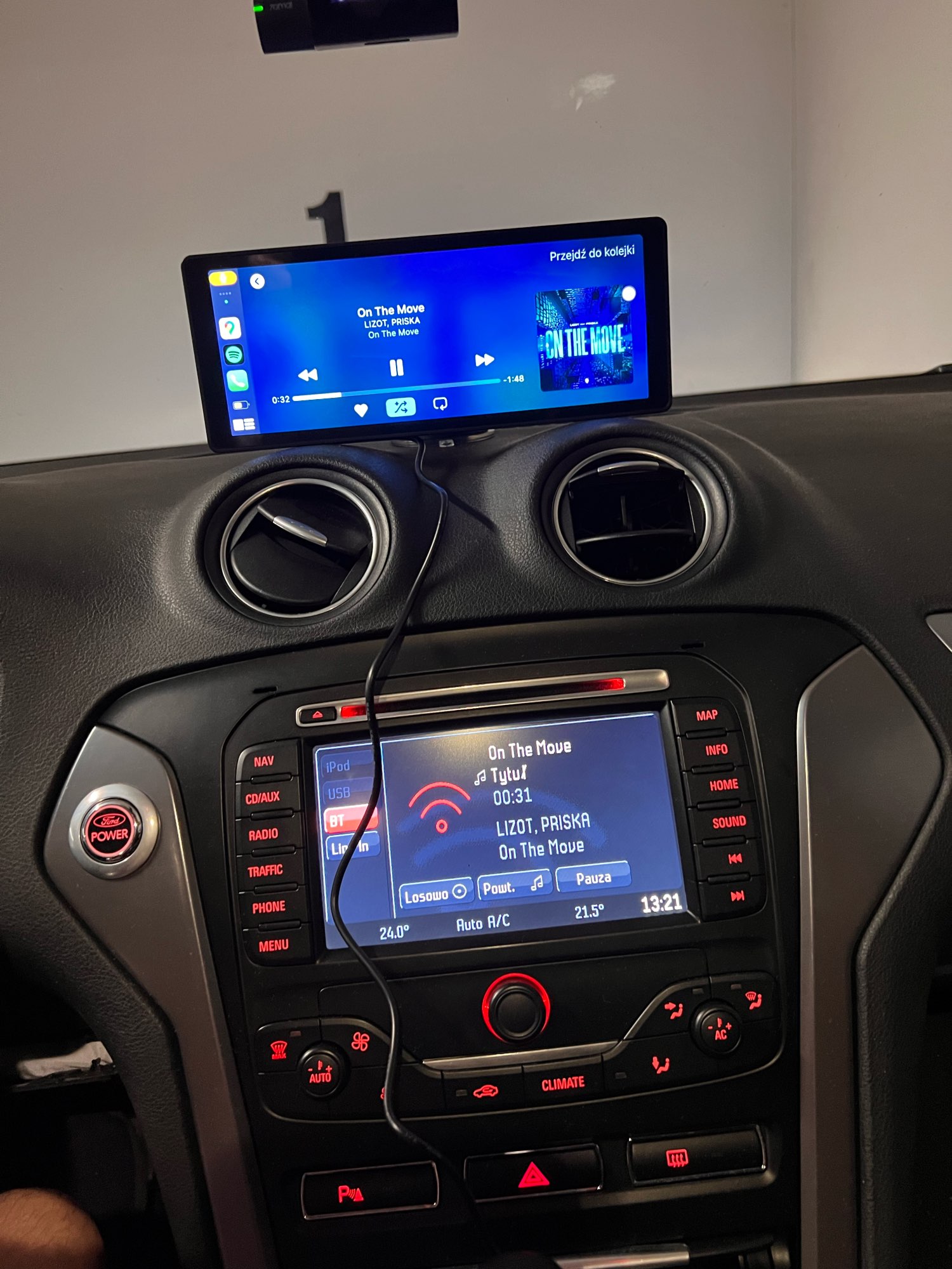The device is very good for its price of 170 PLN, so there is no reason to complain. Connects wirelessly and automatically with Apple CarPlay. It works in parallel with Bluetooth in the car. The only problem is the priority setting of the audio output on the CarPlay on the iPhone, which requires manually switching the audio output to Bluetooth in the car (otherwise the sound is played through the built-in speaker). The power cable is very short, so I recommend that you immediately purchase a DC 3.5mm extension to hide the cable under the glass.