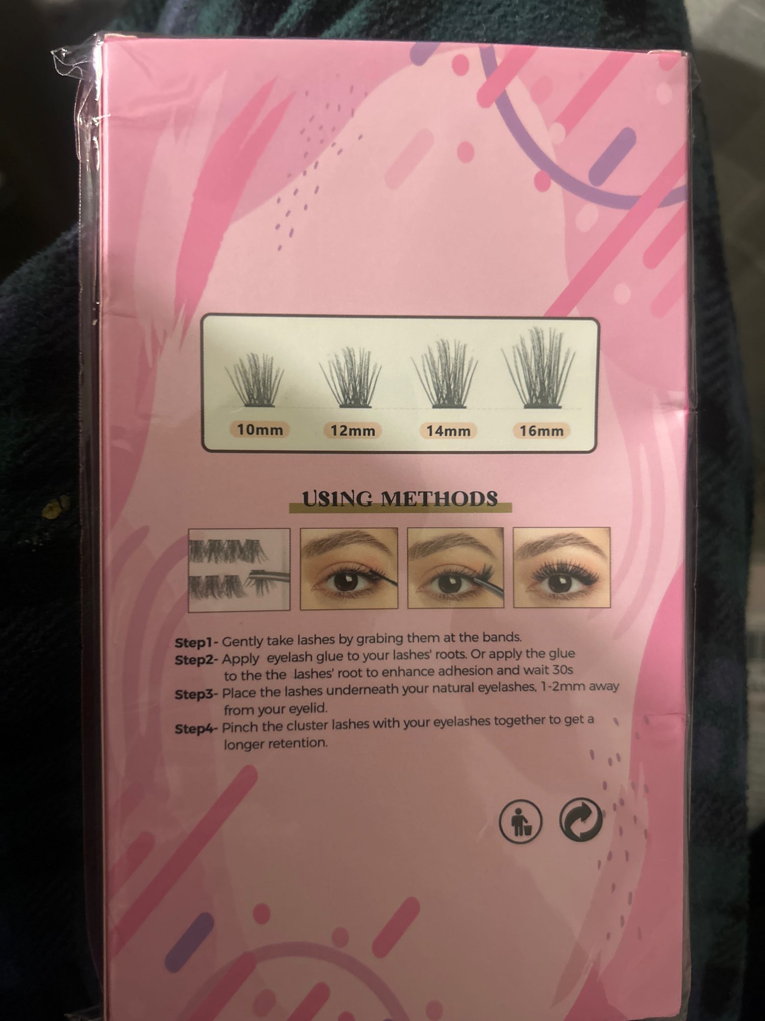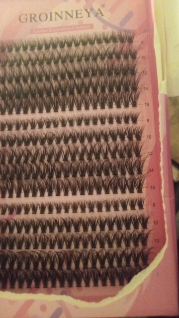Packaging looks great has alot of lashes,comes with directions on the back how to apply comes with the sizes 10mm 12mm 14mm and 16mm