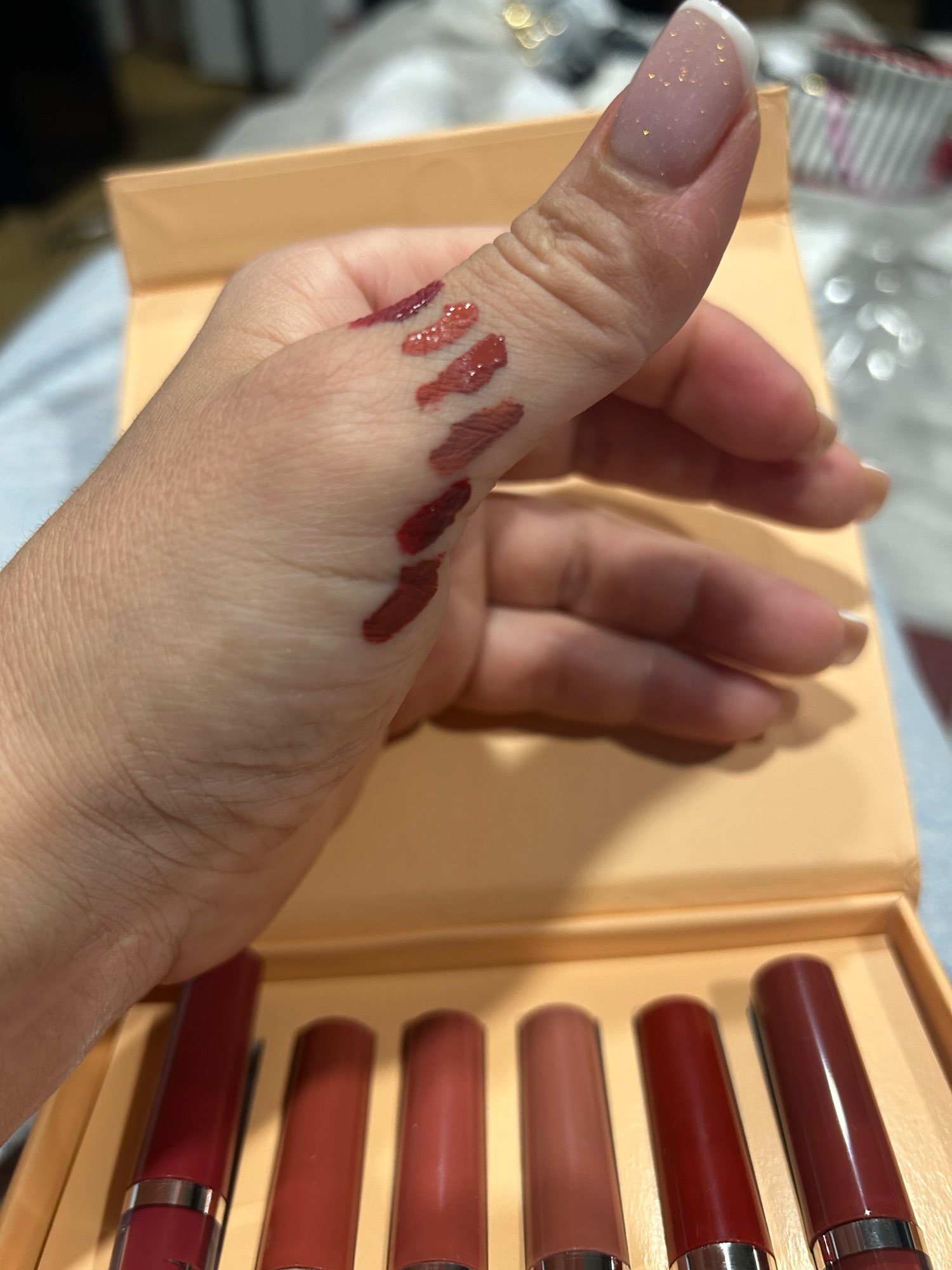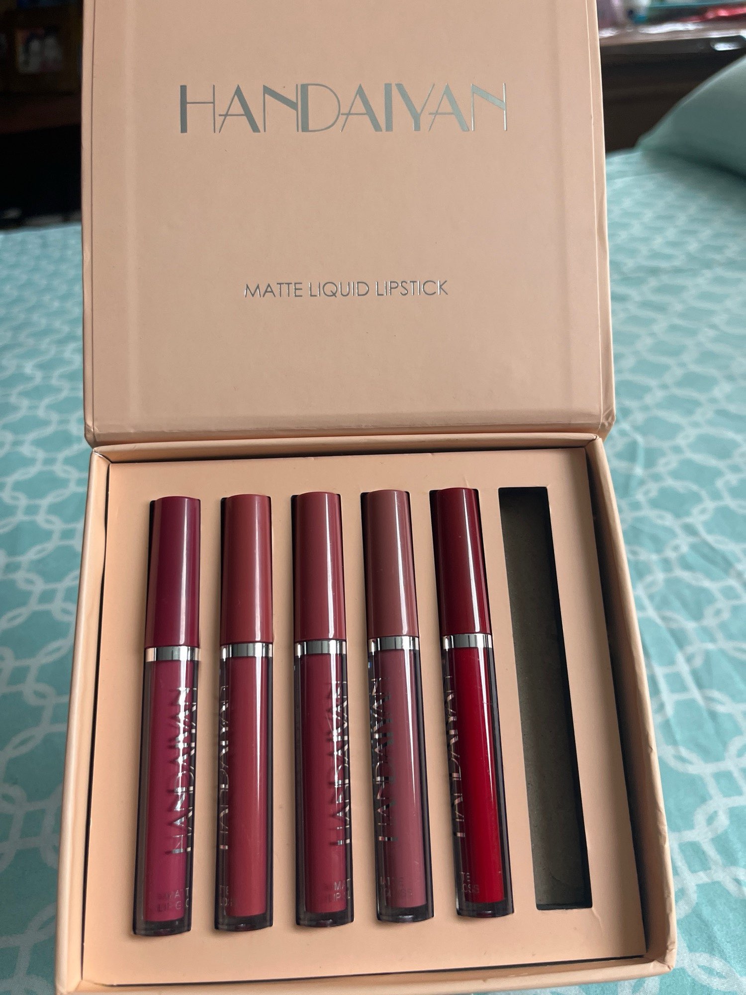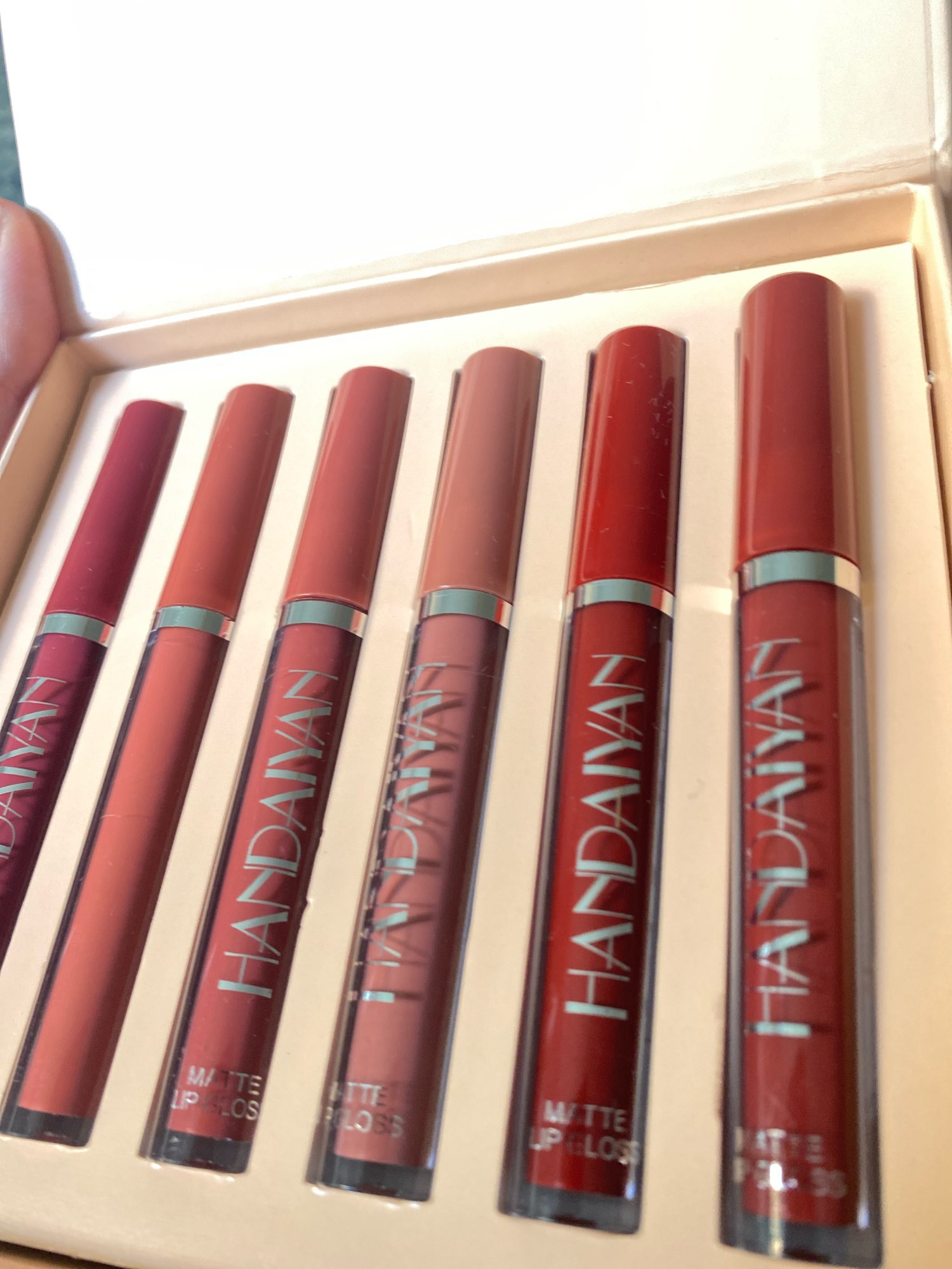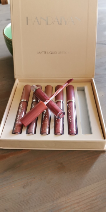 Came quickly. Set looks beautiful and neat. On the finger all colors in a row as in the set. On the lips the first lipstick on the left. The quality is still difficult to say, it takes time. If everything is bad, I will write an additional review.đ