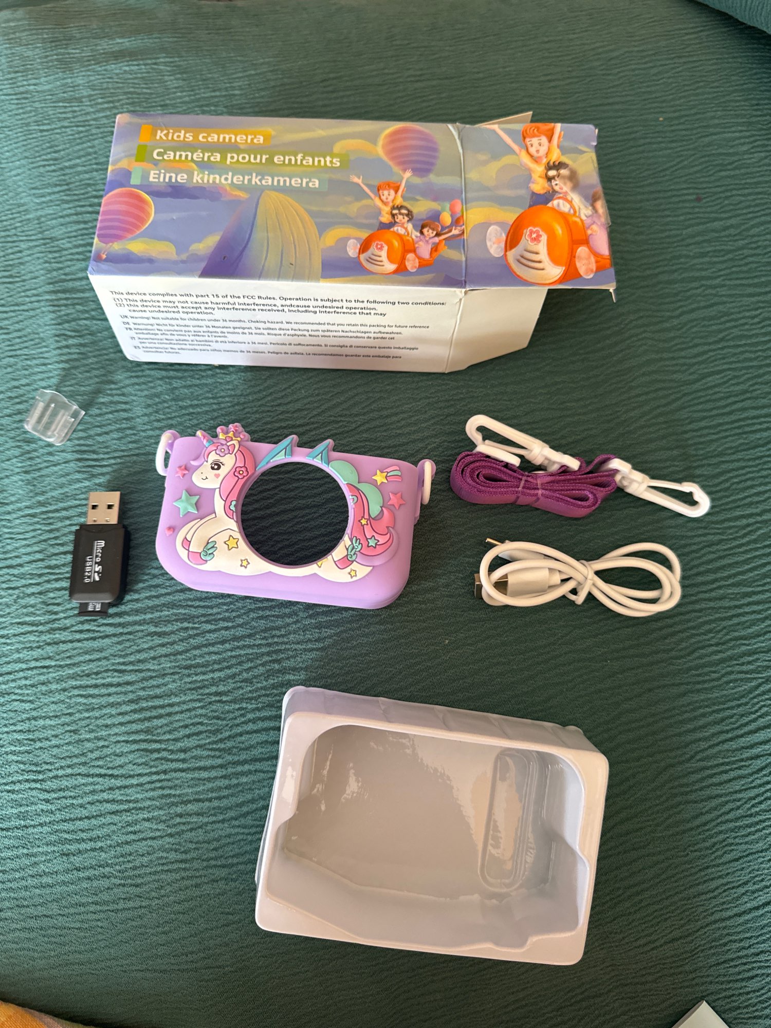 Is great for the price. I was expecting a slightly larger size. But for my 5-year-old niece it's more than enough. Makes videos, selfies, photos, with frames, without them, brought the 32GB micro SD card, Unicorn case, charger cable and hanging tape. It is for gift and the box also arrived intact🙏🏼-- Super happy with the purchase. Ah and the battery came at half charge. With which I could test it without problems, and now I have it carrying to see when a full load lasts. Quality as it is not HD but what more can you order