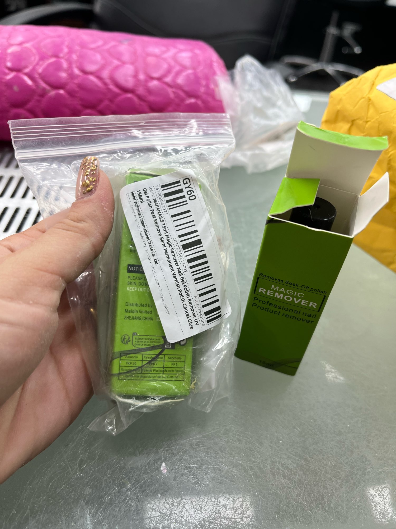 The seller sent super fast, thank you! But the customs of Spain held the product for more than a month and I thought I had lost it :(. I had bought only 1 previously and I liked it so much that I bought 2 again🥰It is an excellent product, it fulfills its function of removing the semi-permanent Polish and does not damage my nails. Doesn't smell bad. I'll keep buying.