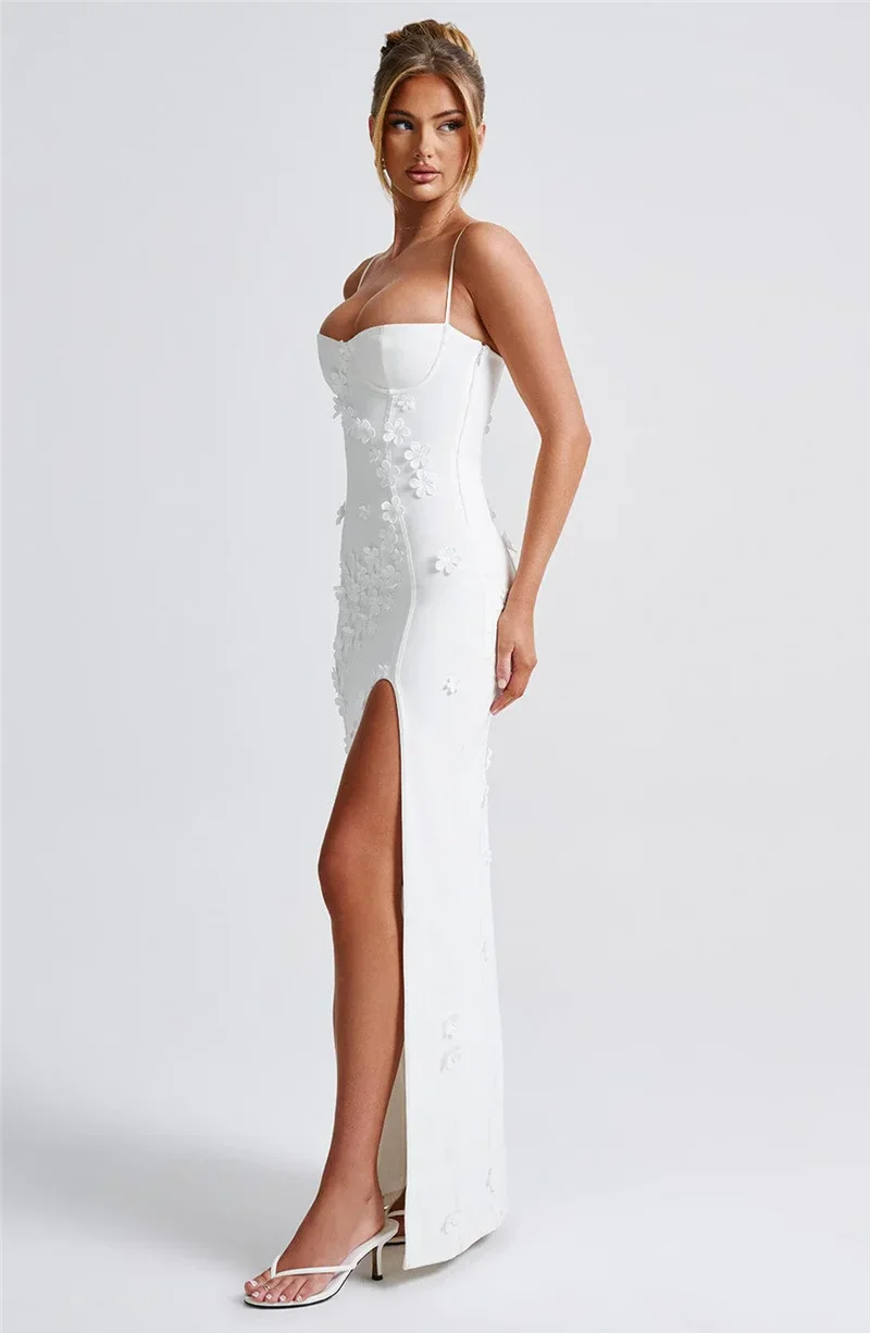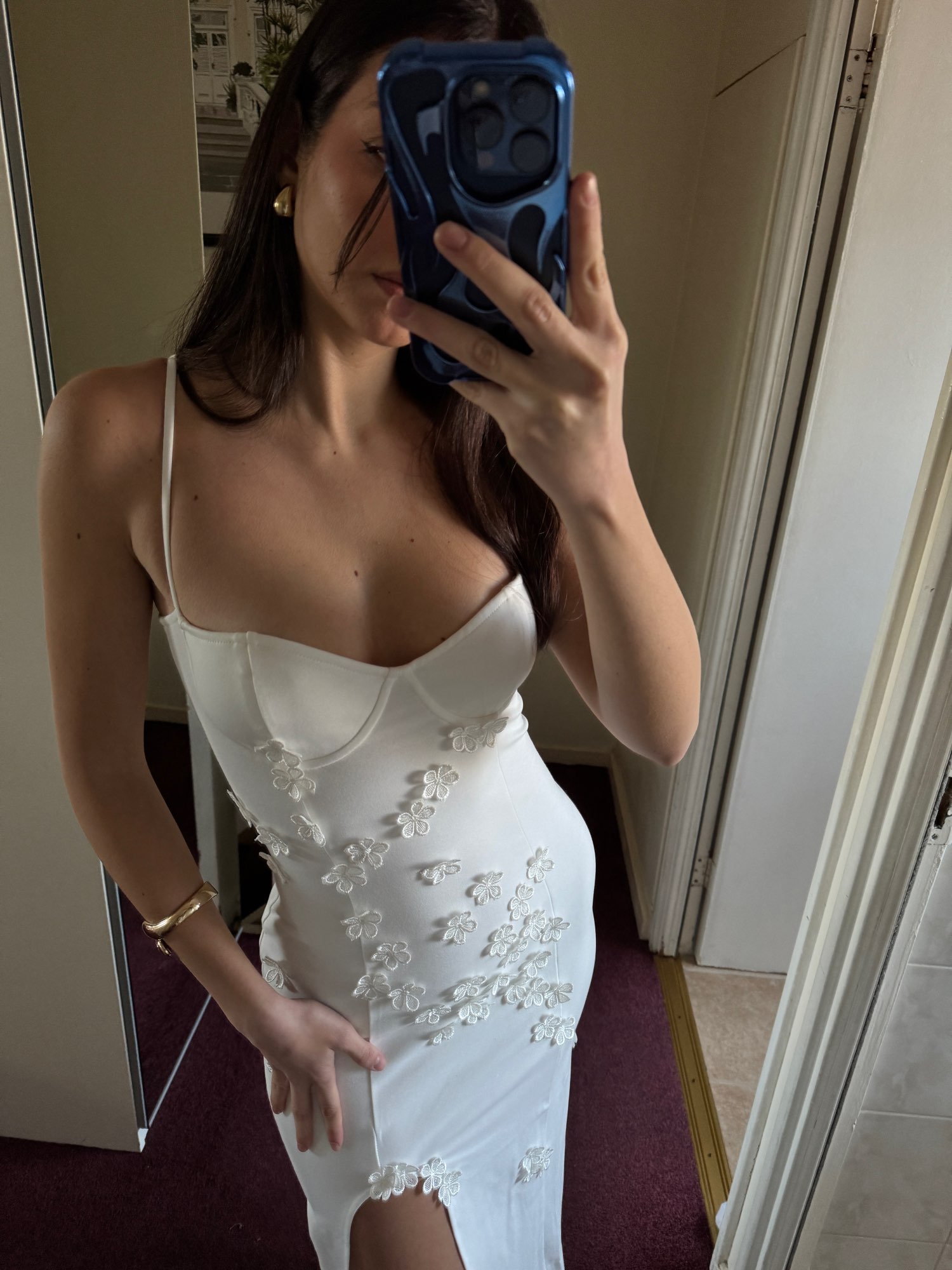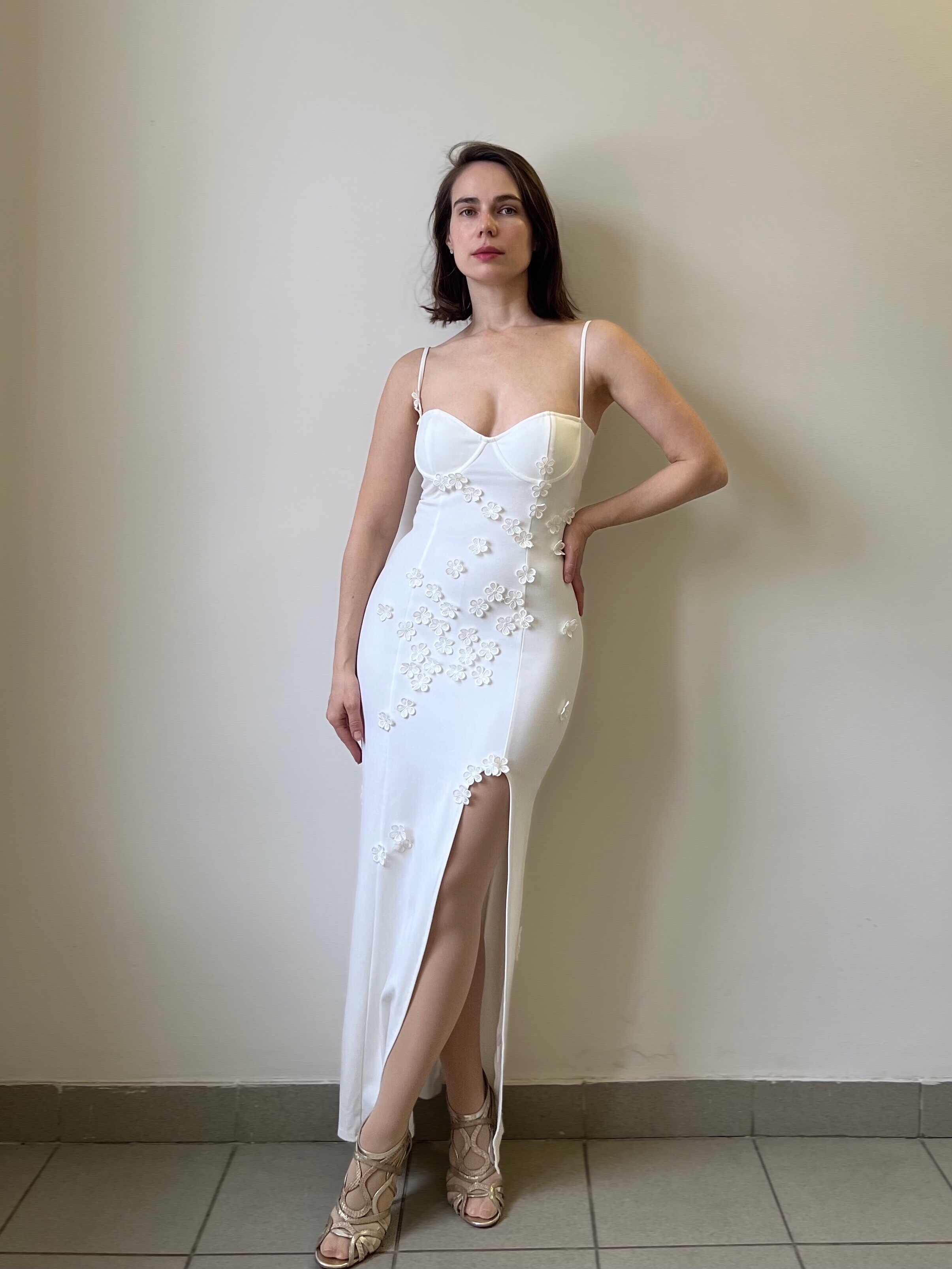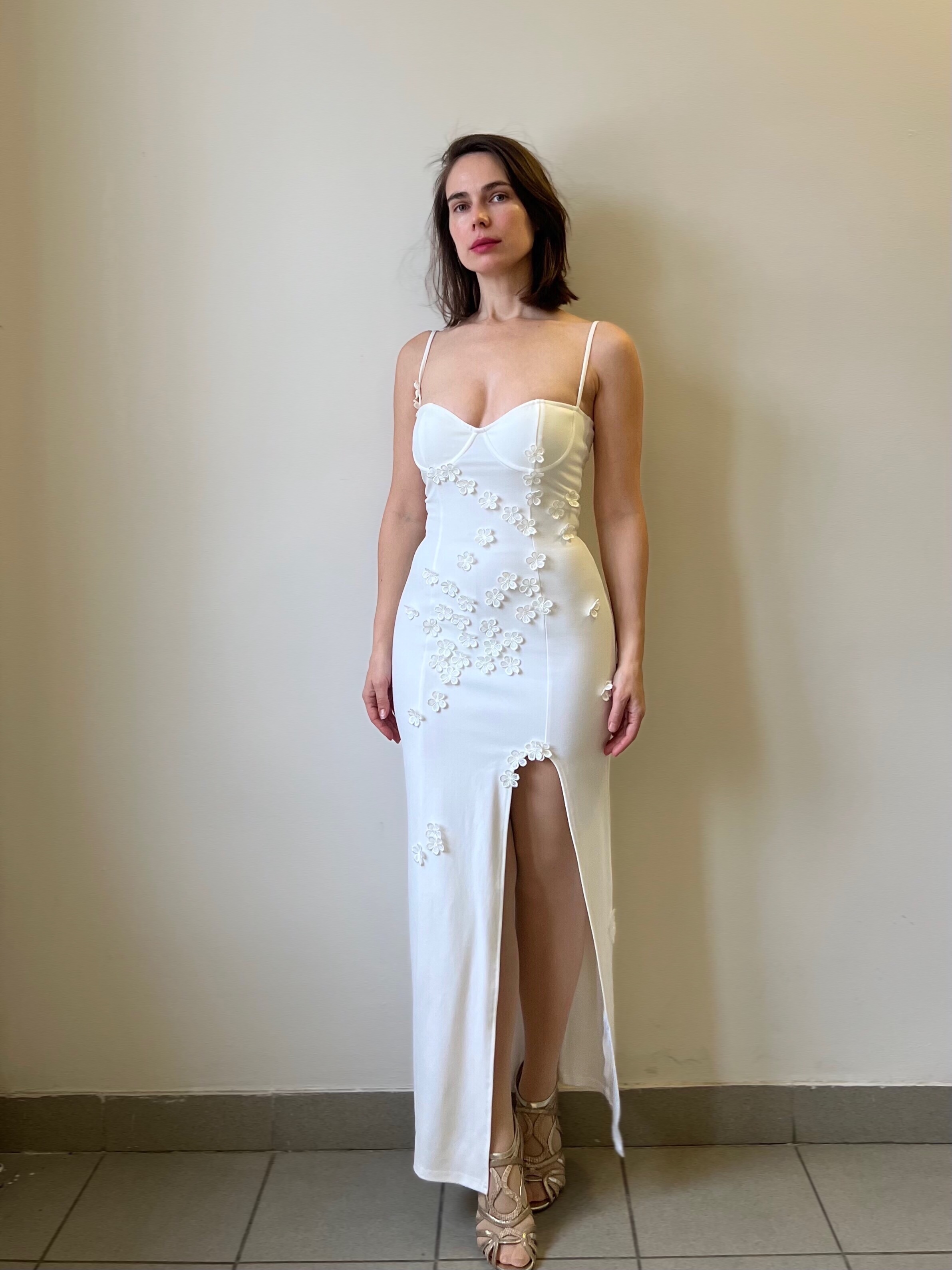 The 3d flowers on this dress is what makes it so cute! Perfect for spring and summer or even holiday. Dress has wired cups, adjustable straps, side slit and 3d flowers. I am wearing size s. I am 5’7 and my bust is 83cm, waist is 68cm and hips are 99cm