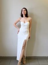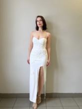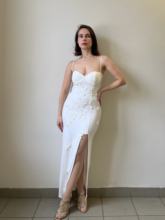 Very beautiful dress with applique flowers. The dress sits clearly on the figure. The fabric is dense, does not shine through, it is good to stretch and elastic. High cut down the leg. Walking in the dress is comfortable. 167 85-65-90 has ordered size s for its parameters, it fits perfectly