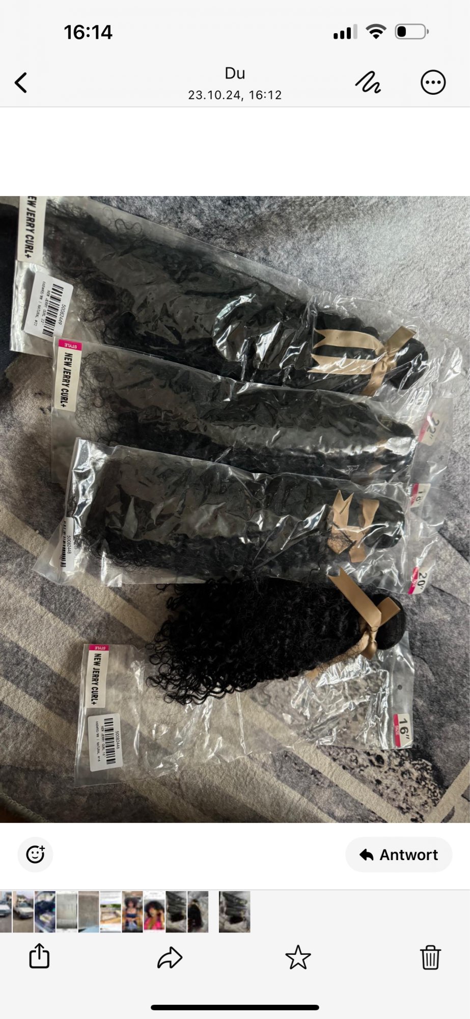 1 Photo: When the Wicks arrived I told myself that they were wrong it was not 22 inches. Photo 2: once wet the Wicks take length. Photo 3: Wicks after 3-4 days still as long, no loss of hair to moistening. Do not get involved and has a curly effect with the right products. I'm satisfied. Only flat: unpleasant smell at the opening.