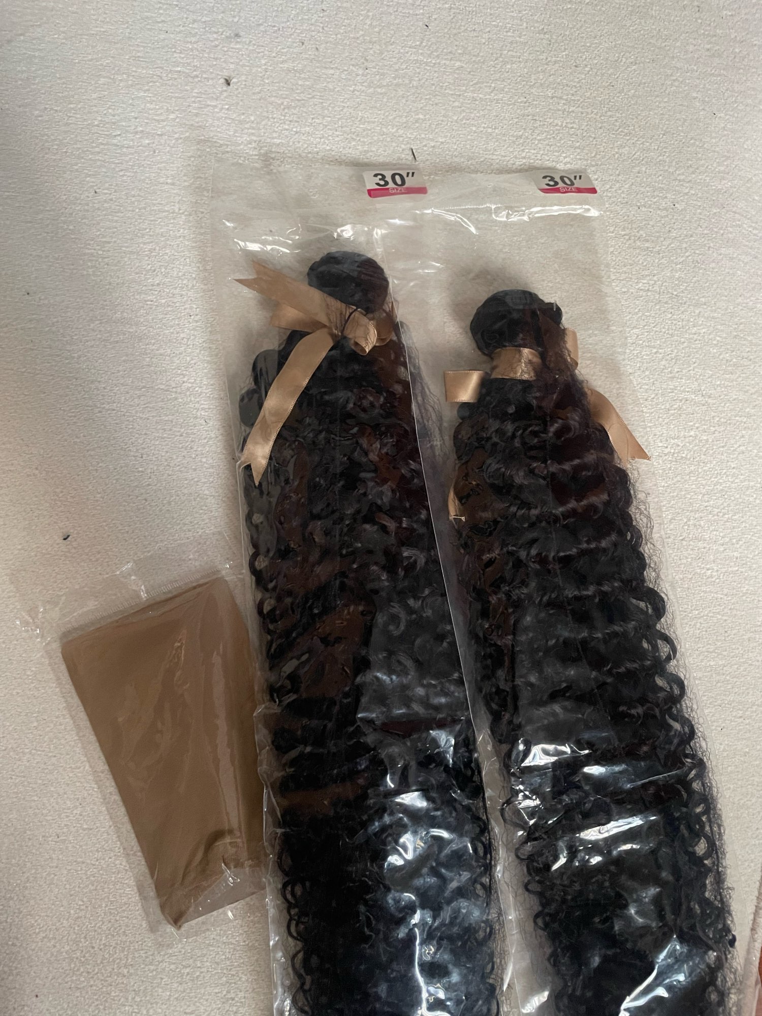 Hair has a little smell but nothing a wash wouldn’t fix. Bundles are a nice size even though their a but short. Maybe they will stretch after washed and conditioned. Cant beat it for the price though. 4 stars because i haven’t installed yet