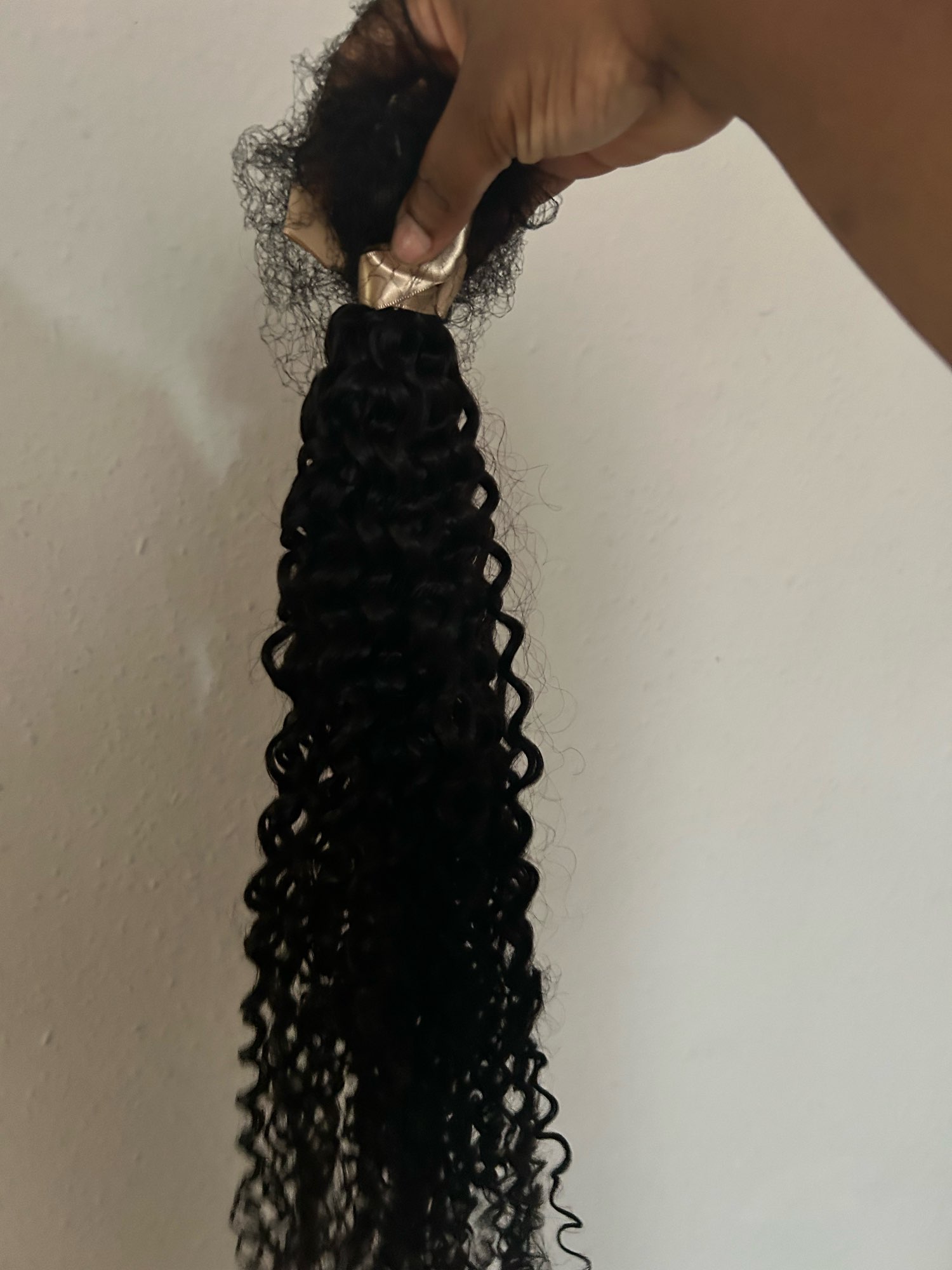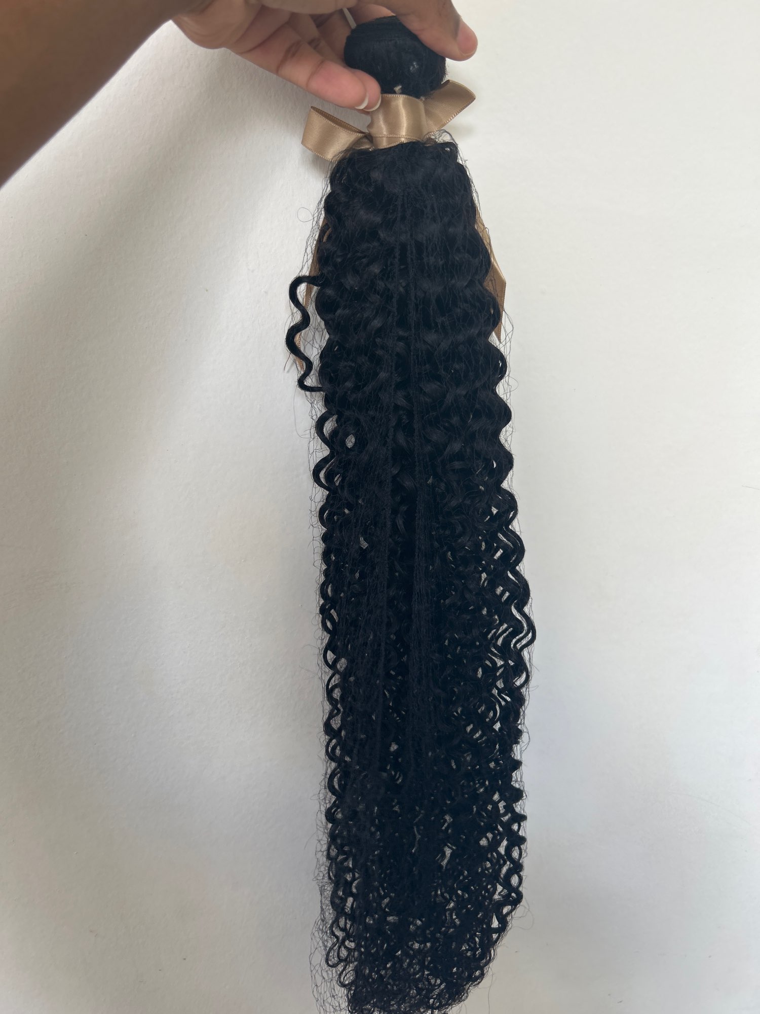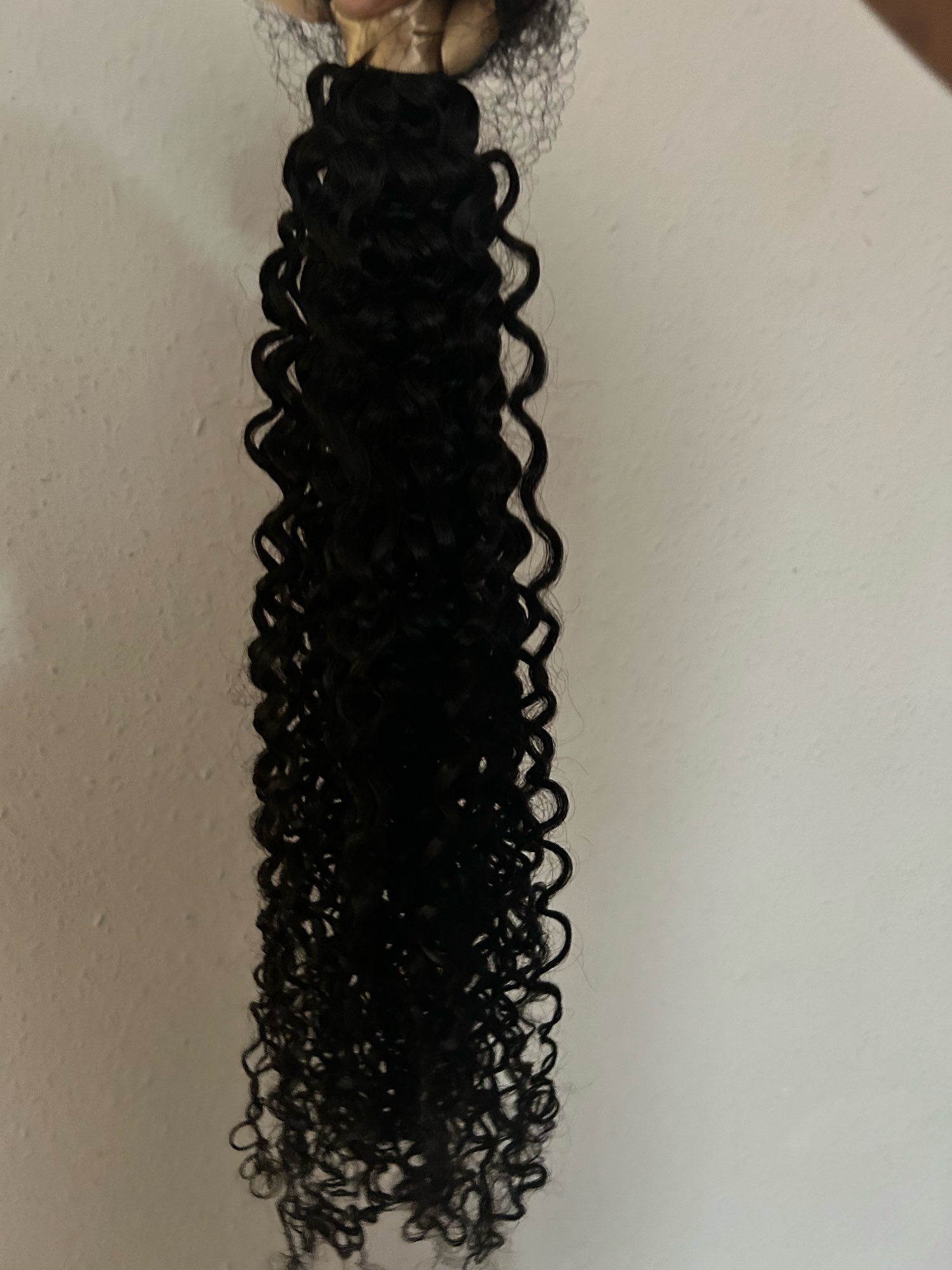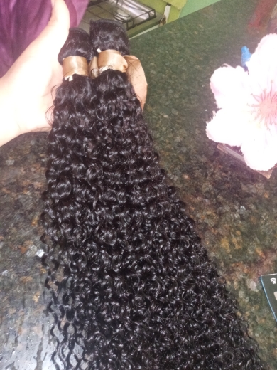 Good hair Nice curly hair. I wanted longer but nice for the most part to get a more natural defined hair look. This is human hair and it is very soft and easy to manage. This bundle can be washed and restyled and installed in so many ways. You can sew this hair in, glue it in, tape it in, clip it in or make a high or low ponytail. This is great quality hair.