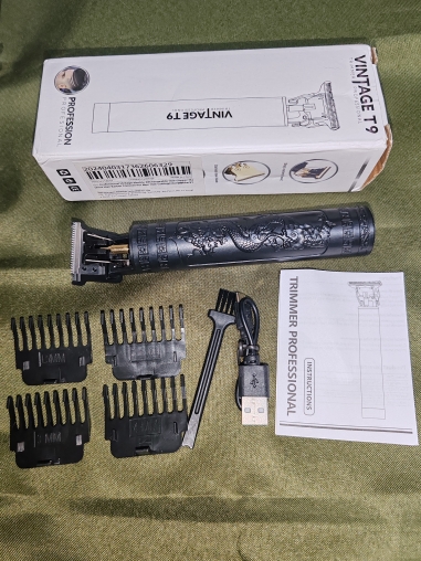 The Trimmer was packed in a box, came quickly with 4 nozzles, a brush and a charging cord. Works well. I like the appearance.