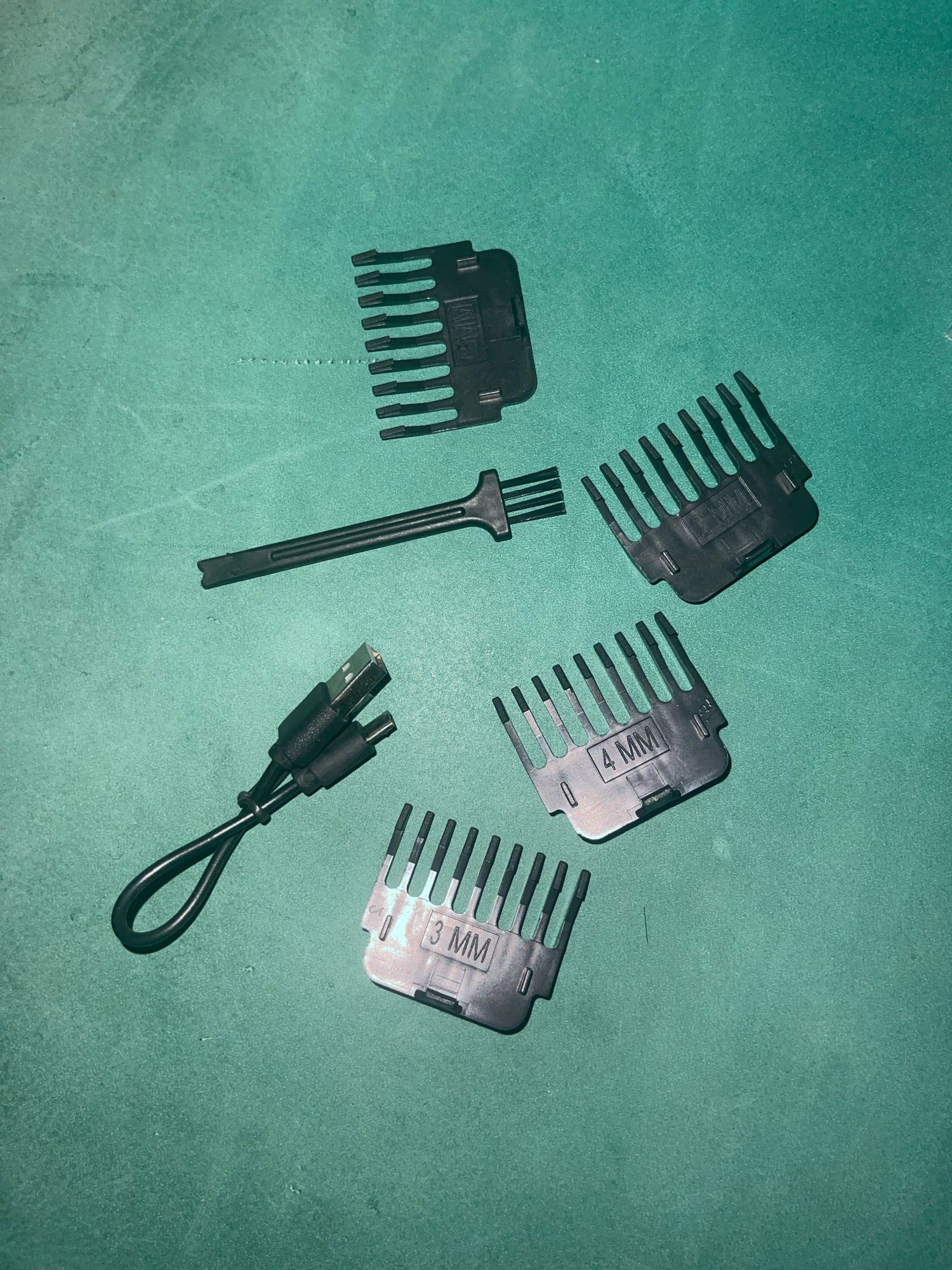 As the picture, it comes with cutting parts and its charging cable and its cleaning brush, very good product, excellent material