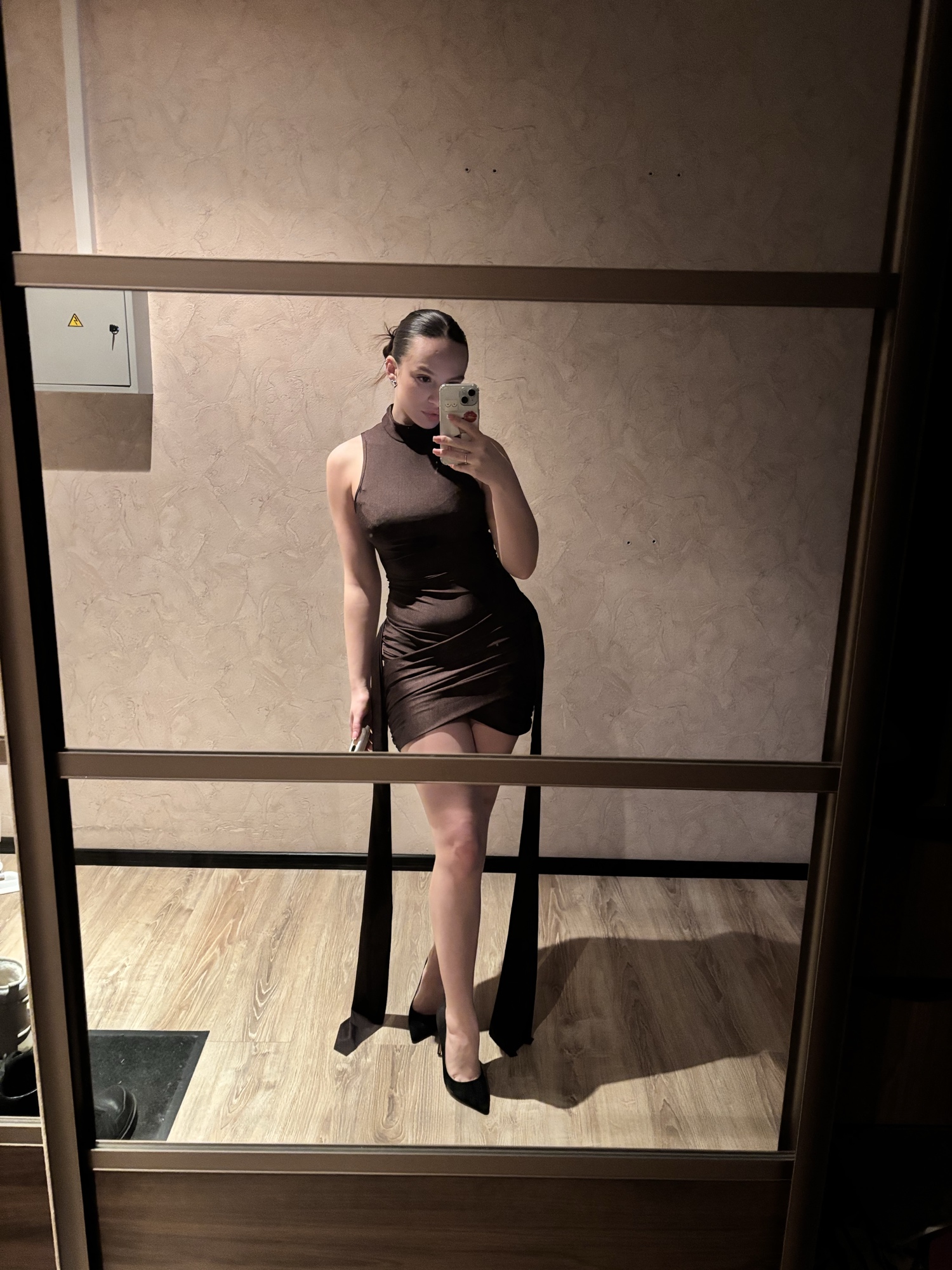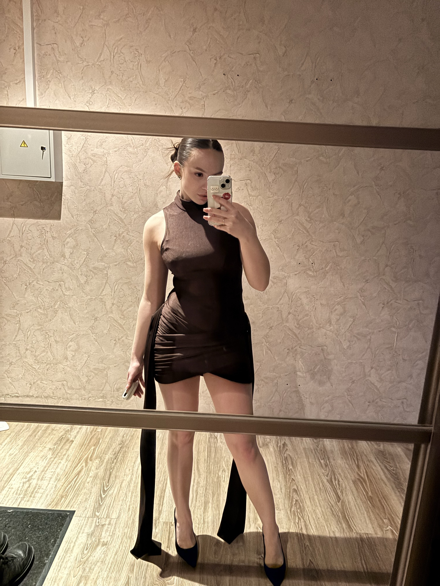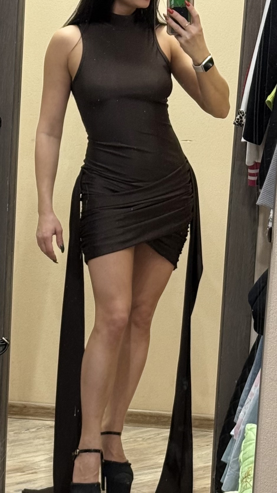 Amazing dress, it hides all the flaws, even if you like me have a side and a tummy. My Russian size L. Beautiful color chocolate. For the height of 173, the tapes do not trudge along the floor, slightly touch. The dress can be tied differently and also beautiful, wrapped ribbons at the waist and side with a knot or bow. Very fast delivery in just a week! I am waiting for holidays, or travel, the photo in it will be excellent. The chest shines a little as if emphasizing, but you can buy overlays. The length is also super.